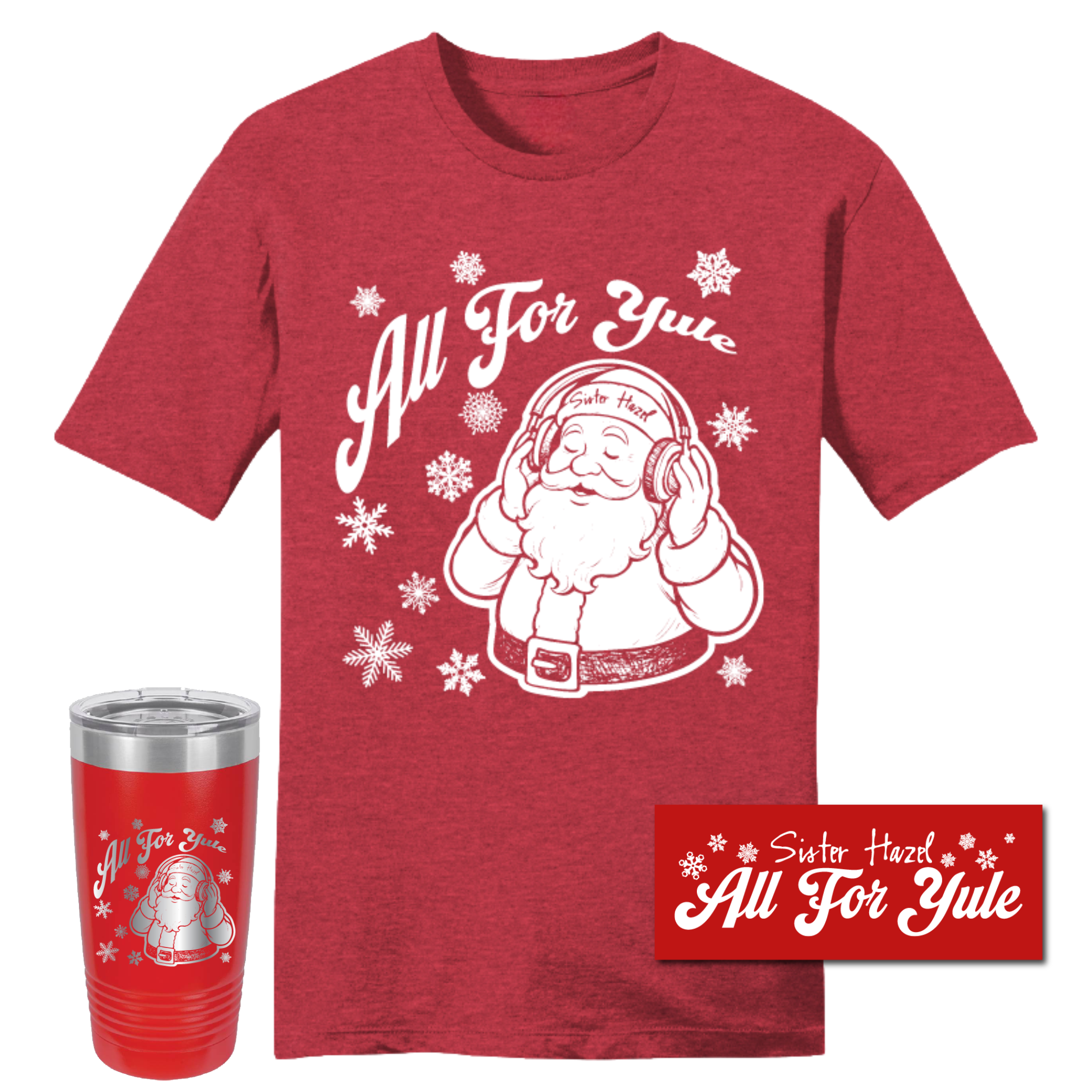 This bundle includes the All For Yule t-shirt, tumbler and sticker.